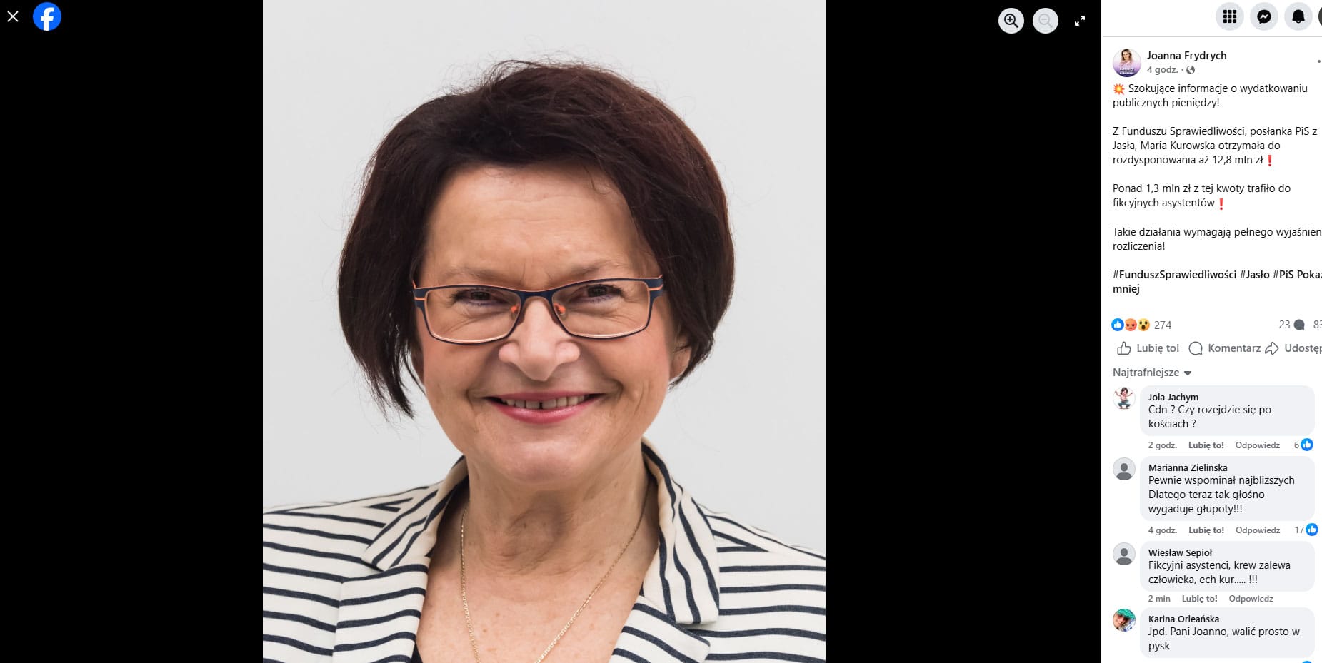 Joanna Frydrych opublikowała wpis, w którym poinformowała, że według pozyskanych przez nią danych Maria Kurowska miała otrzymać do rozdysponowania z Funduszu Sprawiedliwości 12,8 miliona złotych. – Ponad 1,3 mln zł z tej kwoty trafiło do fikcyjnych asystentów! Takie działania wymagają pełnego wyjaśnienia i rozliczenia! – napisała posłanka Joanna Frydrych. Określiła te informacje jako szokujące i stwierdziła, że cała sprawa wymaga pełnego wyjaśnienia oraz rozliczenia. Informacja posłanki Koalicji Obywatelskiej została szeroko udostępniona w mediach społecznościowych.