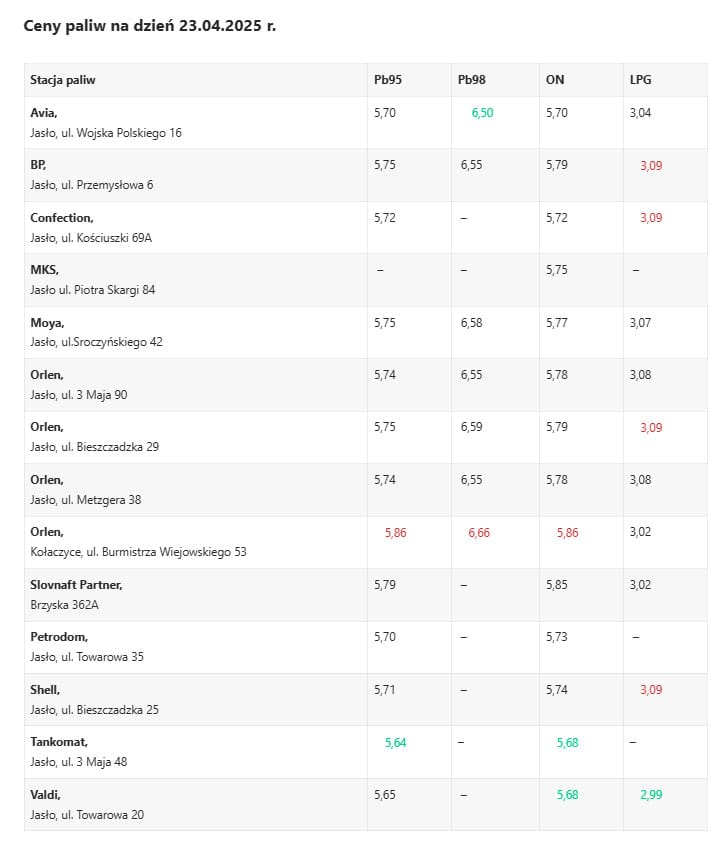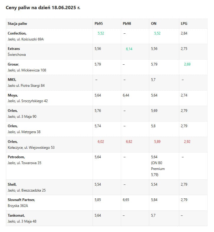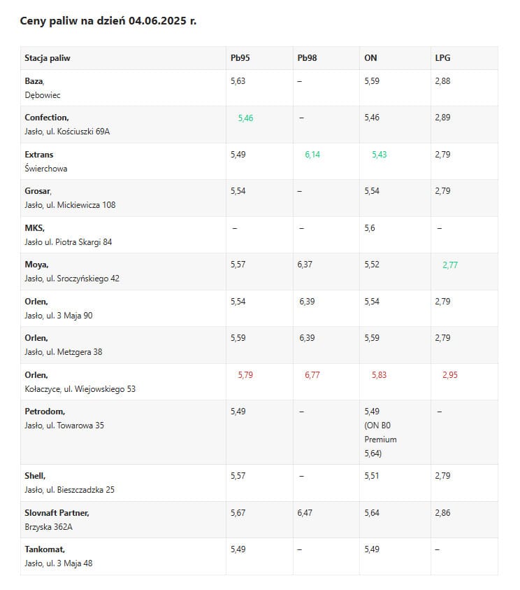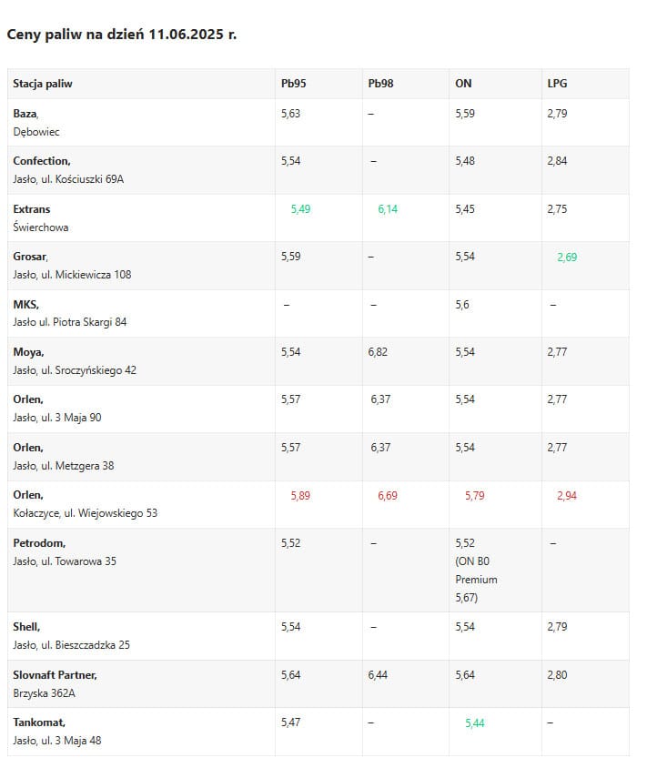 | Orlen, Jasło, ul. Metzgera 38 | 5,99 | 6,79 | 6,14 | 2,79 |