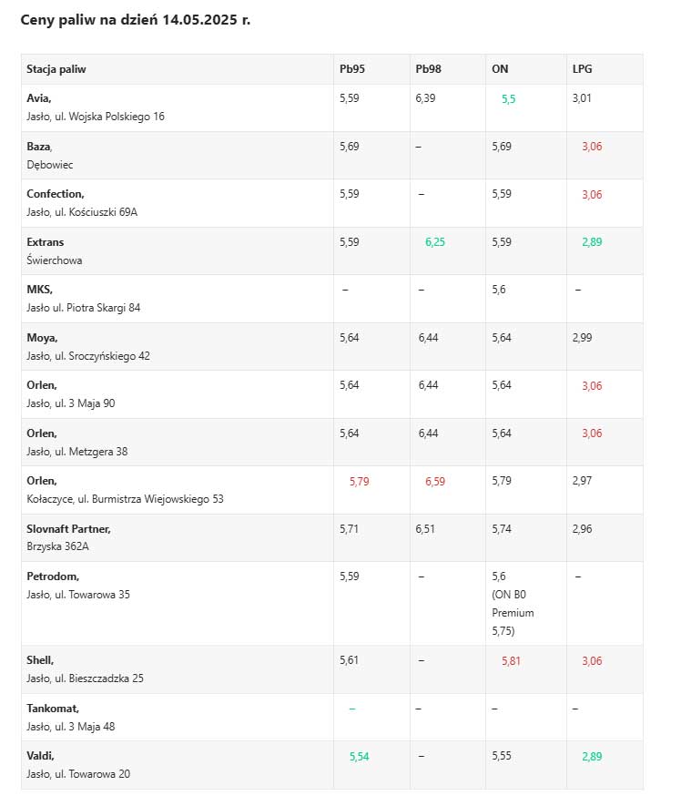 | Orlen, Jasło, ul. 3 Maja 90 | 5,99 | 6,79 | 6,14 | 2,79 |