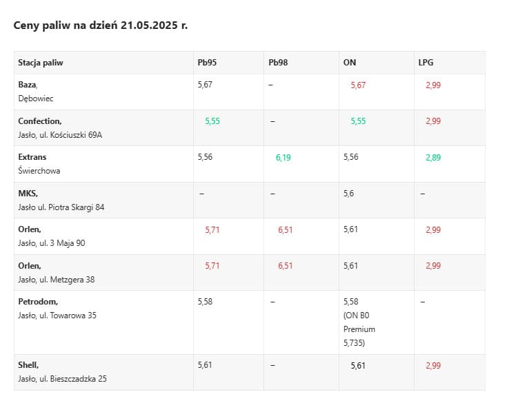 | Stacja paliw | Pb95 | Pb98 | ON | LPG |