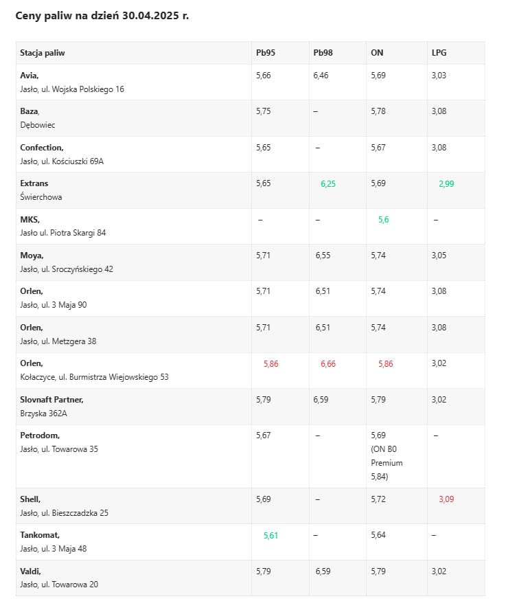 Jesteśmy jedynym rzetelnym źródłem informacji o cenach paliw w powiecie jasielskim. W naszej tabeli podajemy ceny z jednego dnia w miesiącu.