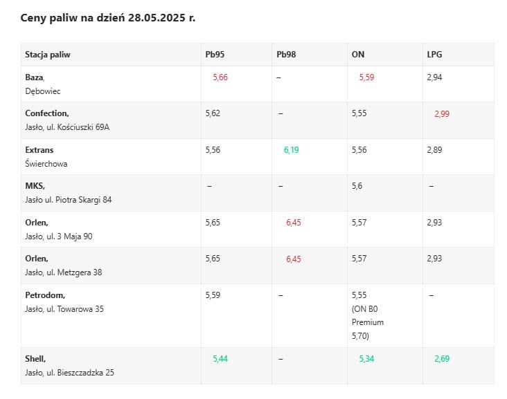 Z kolei kolorem czerwonym wyróżniamy najwyższą cenę danego rodzaju paliwa.