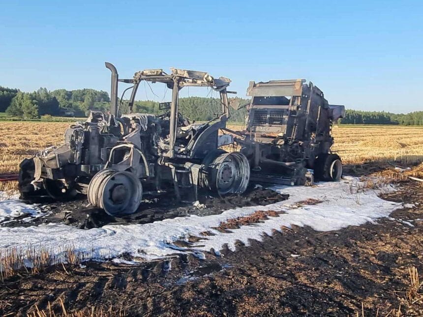 Jako pierwsi na miejsce dotarli druhowie z OSP Szebnie, którzy zastali intensywnie rozwinięty pożar obejmujący zarówno ciągnik, jak i prasę. Strażacy natychmiast sprawili linię gaśniczą i rozpoczęli działania gaśnicze, jednocześnie zabezpieczając pobliskie ściernisko, aby zapobiec rozprzestrzenieniu się ognia.