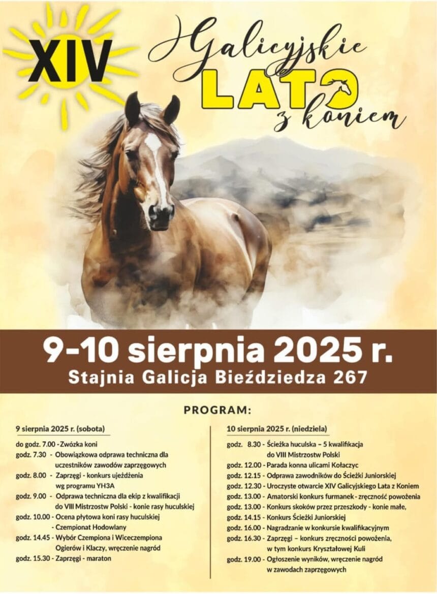Już w dniach 9-10 sierpnia 2025 roku w Stajni Galicja w Bieździedzy odbędzie się XIV edycja Galicyjskiego Lata z Koniem. To wyjątkowe wydarzenie przyciąga miłośników koni, jeździectwa oraz tradycji związanych z końmi rasy huculskiej z całej Polski.