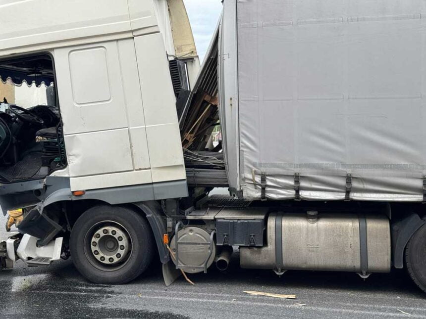 Na drodze krajowej przy rynku w Kołaczycach doszło do zdarzenia drogowego z udziałem samochodu ciężarowego. Kierujący ciągnikiem siodłowym nagle zahamował i ładunek, który przewoził runął do przodu samochodu uszkadzając naczepę oraz kabinę kierowcy.