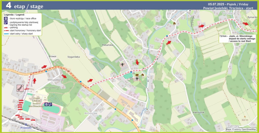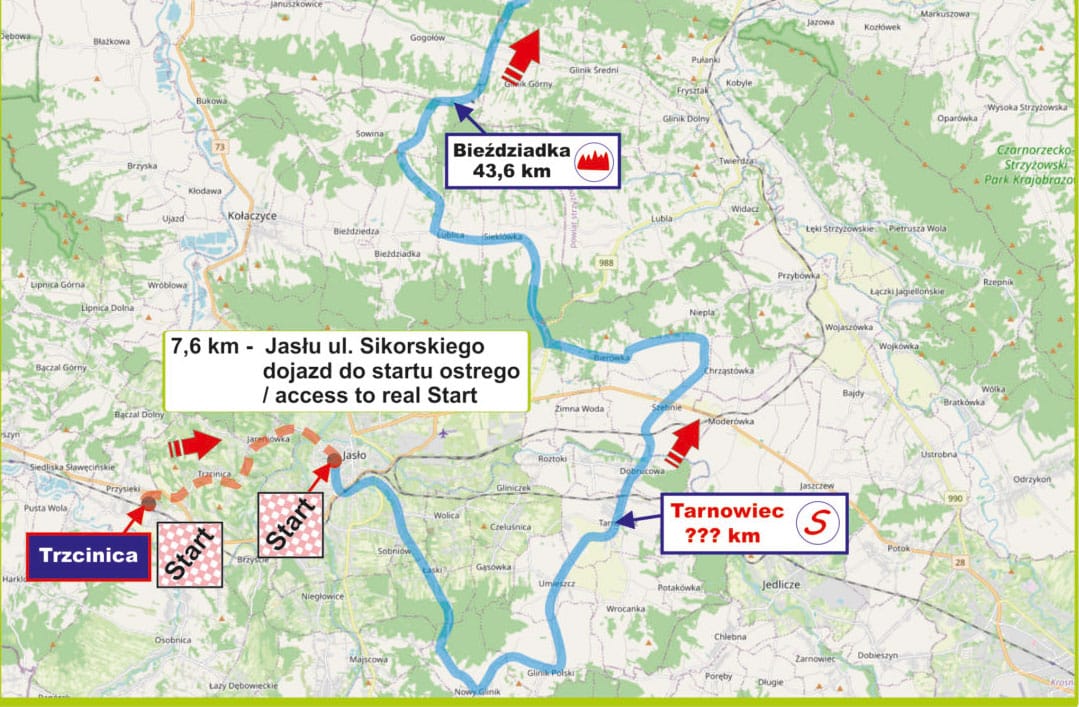 Czwarty etap rozpocznie się startem honorowym w Trzcinicy na wysokości tamtejszego liceum. Następnie zawodnicy wjadą na drogę krajową i skierują się w stronę Jasła. Przejadą ulicą Mickiewicza w Szkolną, Krasińskiego i do ulicy Sikorskiego, gdzie przy Miejskim Ośrodku Sportu i Rekreacji odbędzie się ostry start. Spod MOSiR-u ruszą na ulicę Szopena, następnie 3-go Maja i na światłach w ulicę Metzgera. Dalej w ulicę Kolejową, Grunwaldzą, Floriańską i na rodzine pod wiaduktem w kierunku Tarnowca.