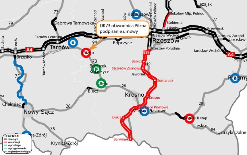 Generalna Dyrekcja Dróg Krajowych i Autostrad oddział w Rzeszowie podpisała umowę na zaprojektowanie i budowę obwodnicy Pilzna w ciągu drogi krajowej nr 73. Jak informuje rzeszowska GDDKiA, wartość kontraktu to prawie 88 milionów złotych, a wykonawcą inwestycji będzie Przedsiębiorstwo Drogowo-Mostowe z Dębicy.