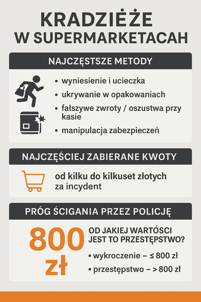 Wartość skradzionych produktów zwykle waha się od kilku do kilkuset złotych. Kluczowe znaczenie ma jednak próg 800 zł – do tej kwoty czyn traktowany jest jako wykroczenie, natomiast powyżej tej wartości stanowi przestępstwo ścigane przez policję i prokuraturę.