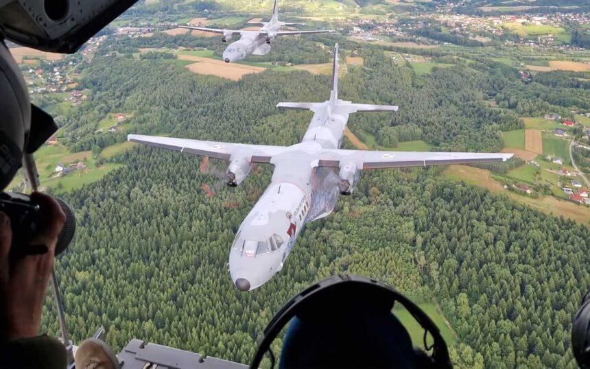 Drugim typem maszyn biorących udział w przelocie była M28 Bryza – lekki, wielozadaniowy samolot produkowany przez PZL Mielec, przystosowany do krótkiego startu i lądowania. Bryza to konstrukcja ceniona w lotnictwie wojskowym za niezawodność i możliwość działania w trudnych warunkach. Może przewozić do 19 pasażerów lub odpowiedni ładunek na dystansie około 1 500 kilometrów. Napędzana jest dwoma silnikami turbośmigłowymi i rozwija prędkość przelotową rzędu 350 km/h. Dzięki kompaktowym rozmiarom i zdolności operowania z krótkich pasów, Bryza świetnie sprawdza się w zadaniach transportowych, patrolowych i desantowych.