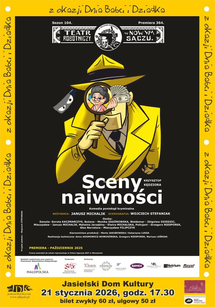 Z okazji Dnia Babci i Dziadka Jasielski Dom Kultury zaprasza na wyjątkowe wydarzenie teatralne. Już 21 stycznia o godz. 17.30 na scenie JDK zobaczymy komedię „Sceny naiwności” w wykonaniu Teatru Robotniczego im. Bolesława Barbackiego w Nowym Sączu.