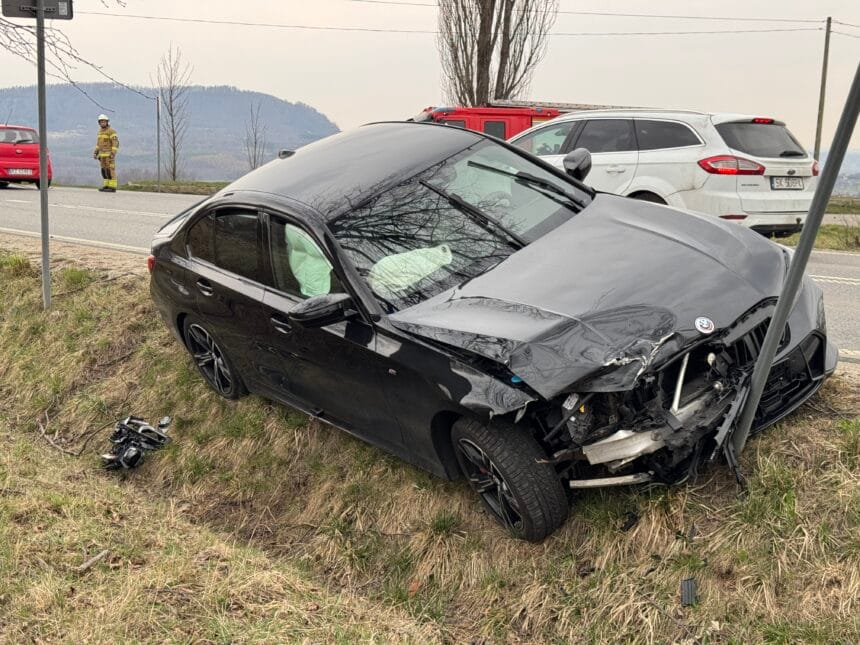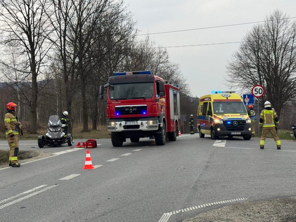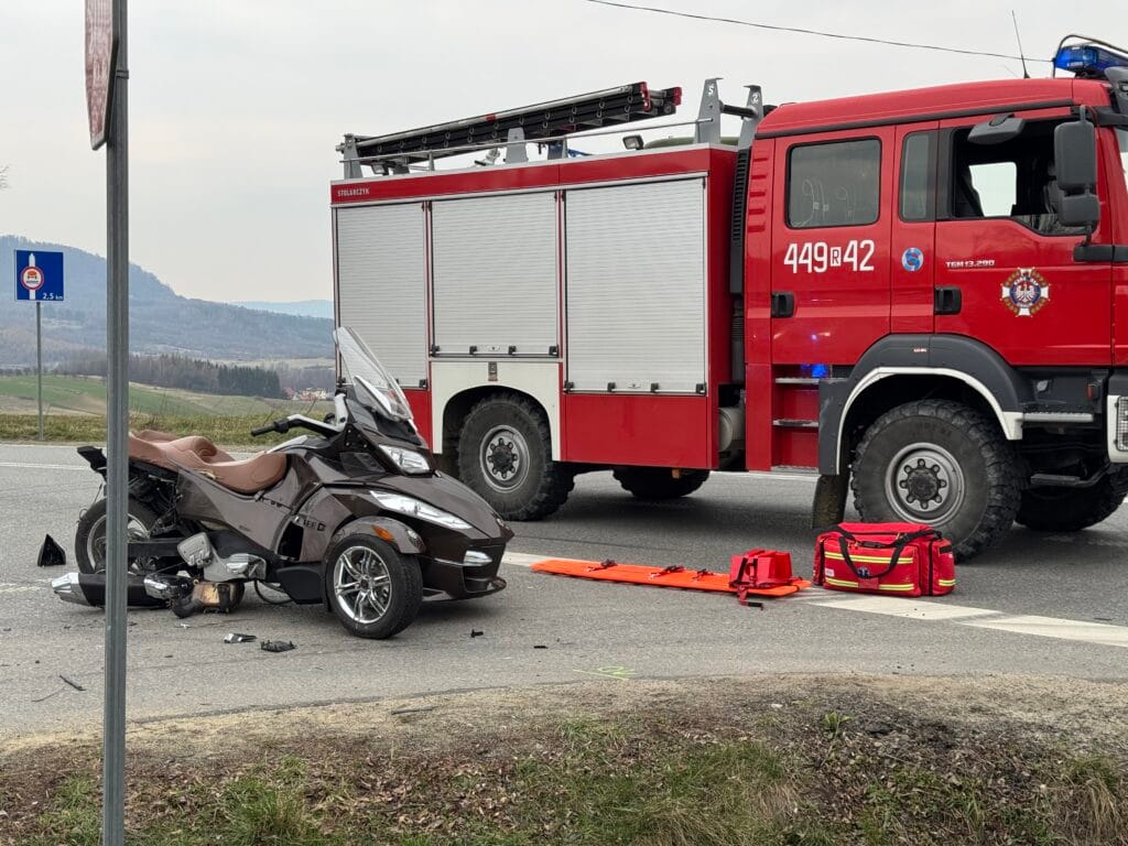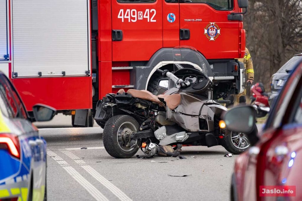 Do wypadku doszło na skrzyżowaniu drogi powiatowej z wojewódzką. Na miejsce wezwano druhów z OSP KSRG Cieklin oraz PSP Jasło. Przybyli na miejsce ratownicy z jasielskiego pogotowia zabrali poważnie rannego 69-letniego motocyklistę do szpitala w Jaśle.