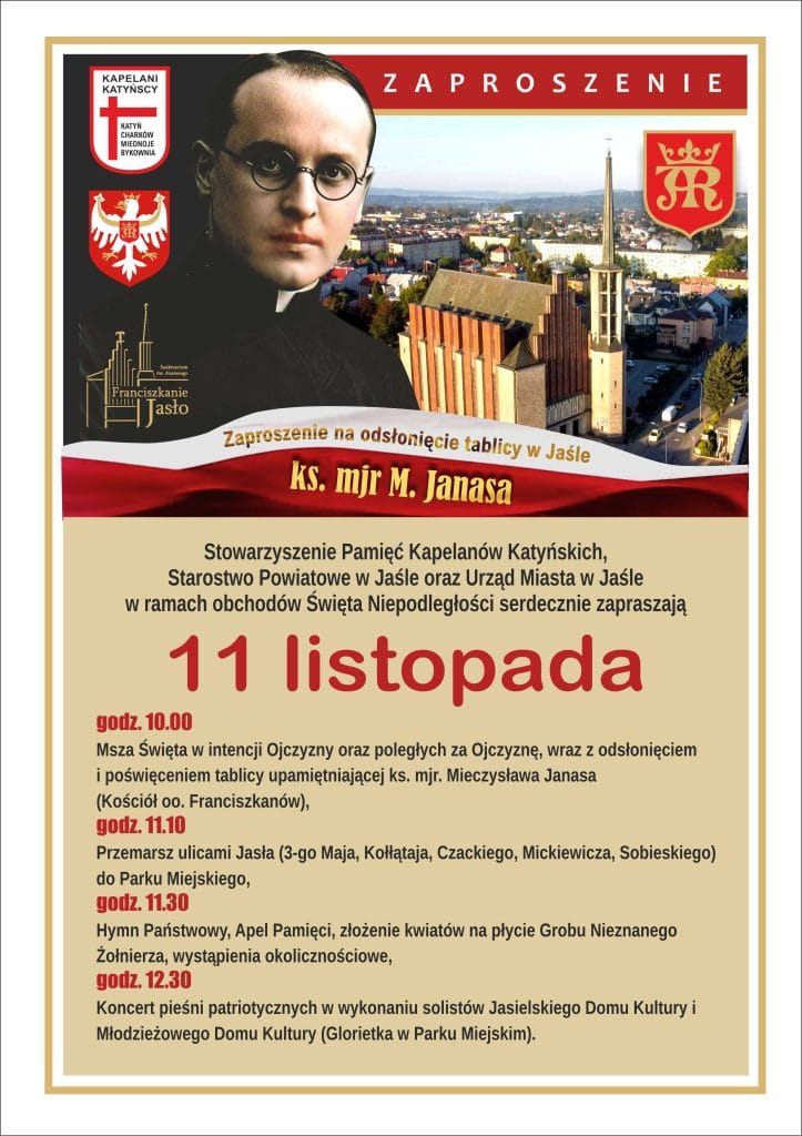 Tegoroczne obchody Święta Niepodległości w Jaśle będą połączone z odsłonięciem tablicy upamiętniającej księdza majora Mieczysława Janasa.